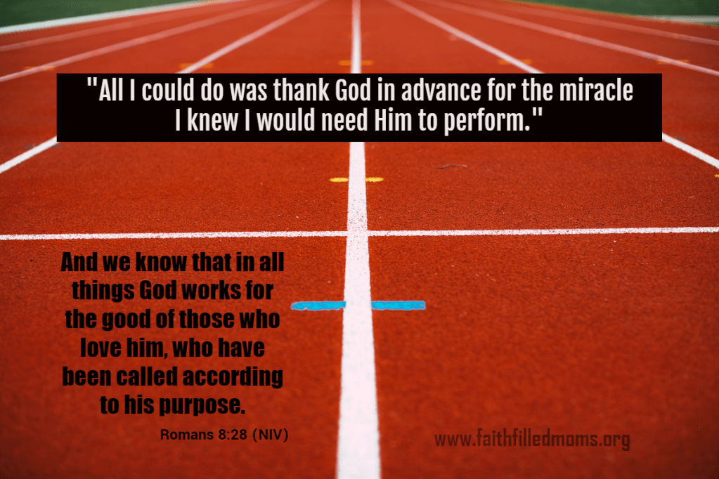 There was a lot of commotion at the sand pit and fear immediately gripped my heart. With everything in me, I wanted to dart across the field. Instead, I calmly walked along the outer perimeter of the track. I knew I should be praying, but I didn’t know what to say. My mind went to 1 Thessalonians 5:18 and I just kept saying “Thank you Jesus, thank you God, thank you Jesus, thank you God.” I had no idea what was waiting for me on the other side of the track, but all I could do was thank God in advance for the miracle I knew I would need Him to perform. I wanted God to remember my initial response was to thank Him while not knowing what was going on, so He would show mercy for whatever it was I was about to face.