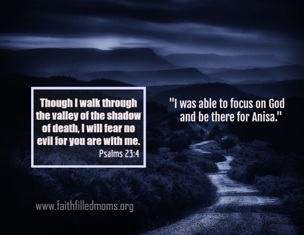 Thankfully, my mom held down my household. That allowed me to just focus on God and be there for Anisa. I held onto Psalms 23:4 to comfort me – Though I walk through the valley of the shadow of death, I will fear no evil because you are with me.